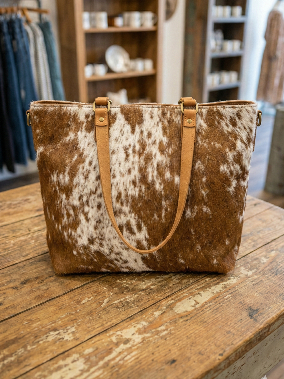 Handcrafted from genuine cowhide leather, this Western-style tote bag features a unique natural pattern and durable leather handles. Stylish, spacious, and one of a kind.