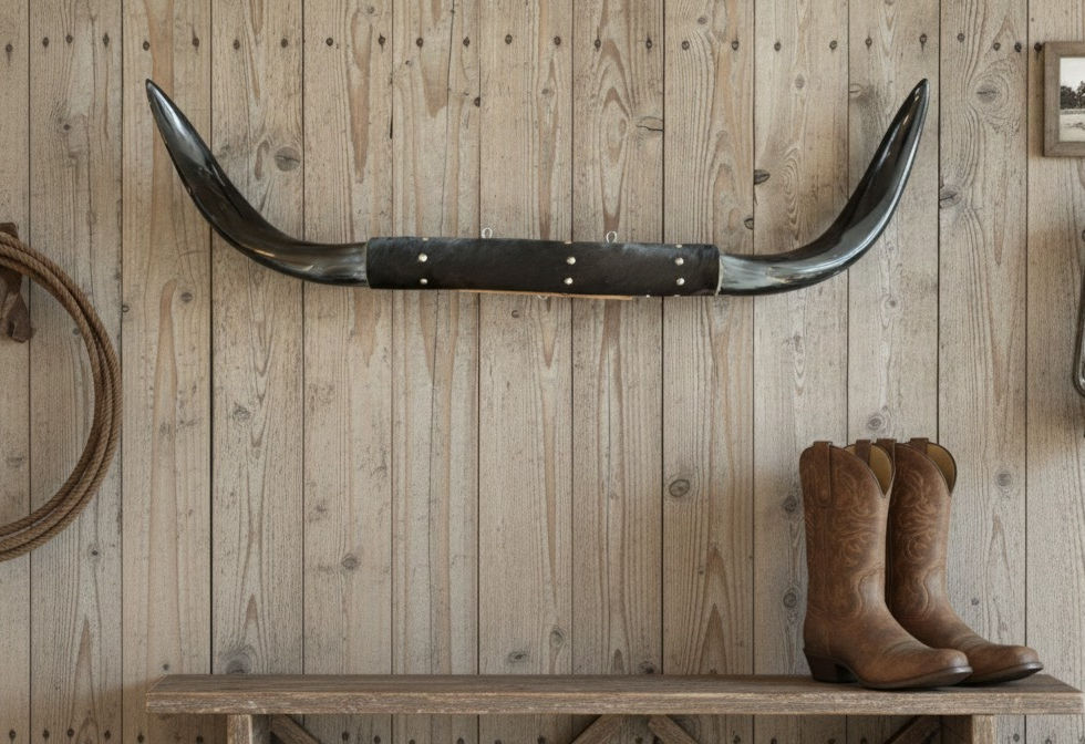 The horns are left true to their natural form, then refined by hand to enhance their weight, curve, and character without erasing what nature put there. The center is wrapped in genuine cowhide leather, carefully fitted to complement the dark tones and anchor the piece with traditional Western craftsmanship.